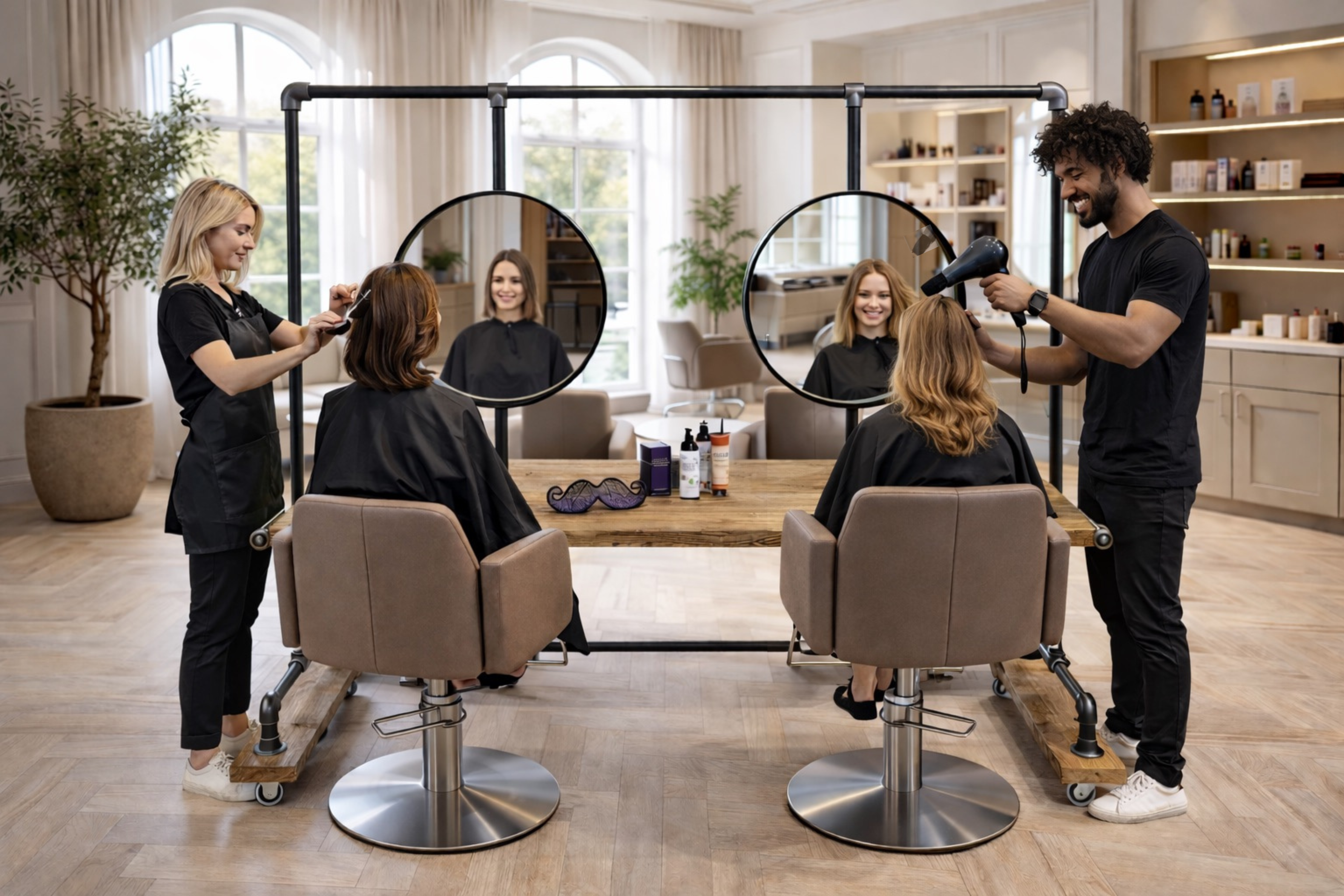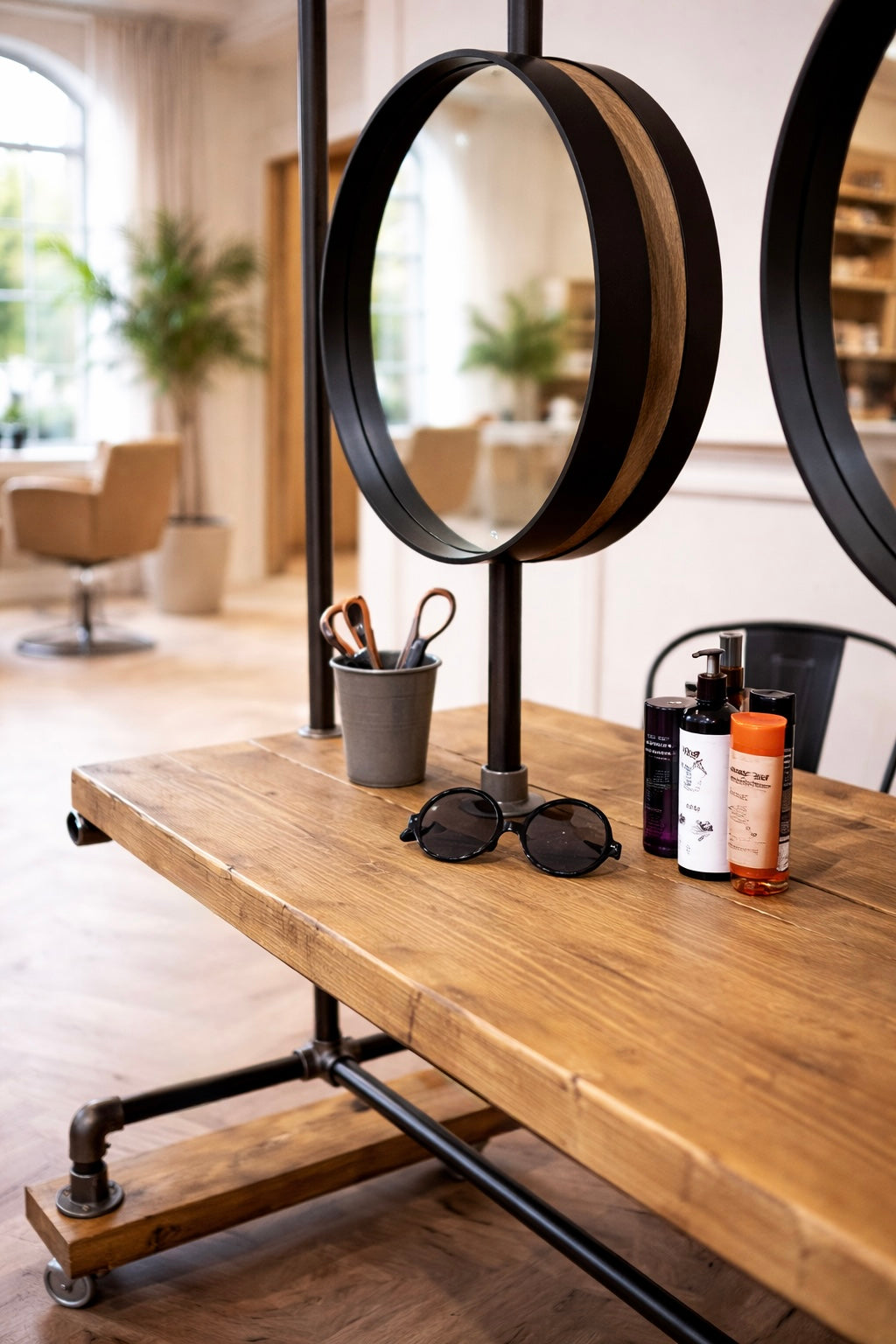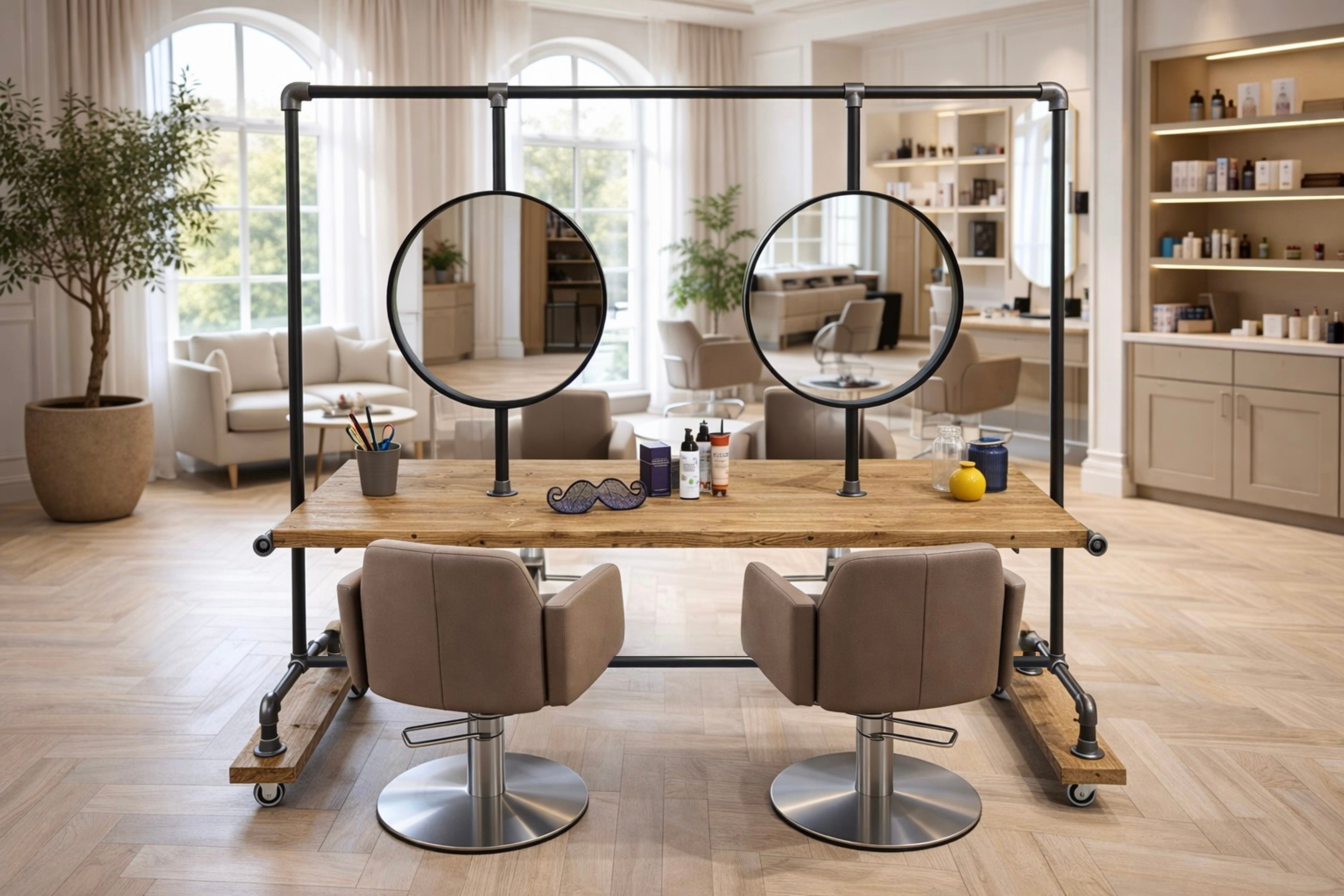 Industrial Style Salon Unit | Barbers, Hairdressing Workstation with Mirrors | Rustic Timber, Steel Tube | Shop, Dressing Room, Stylist