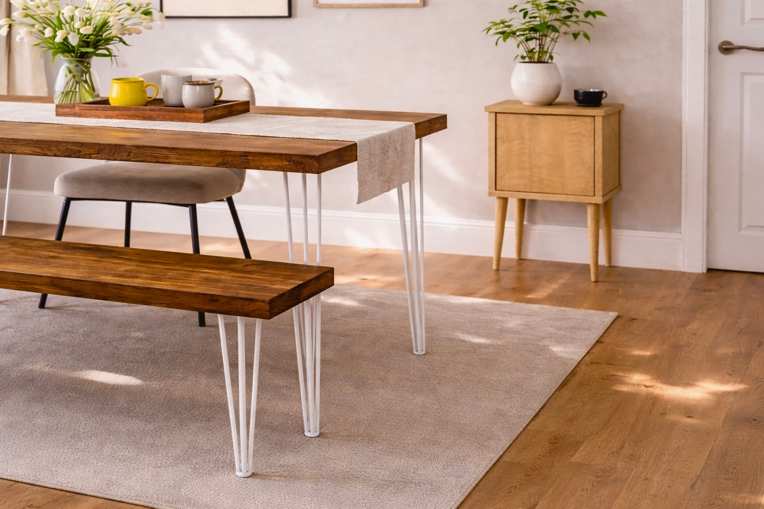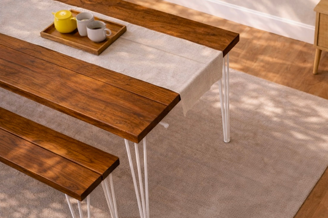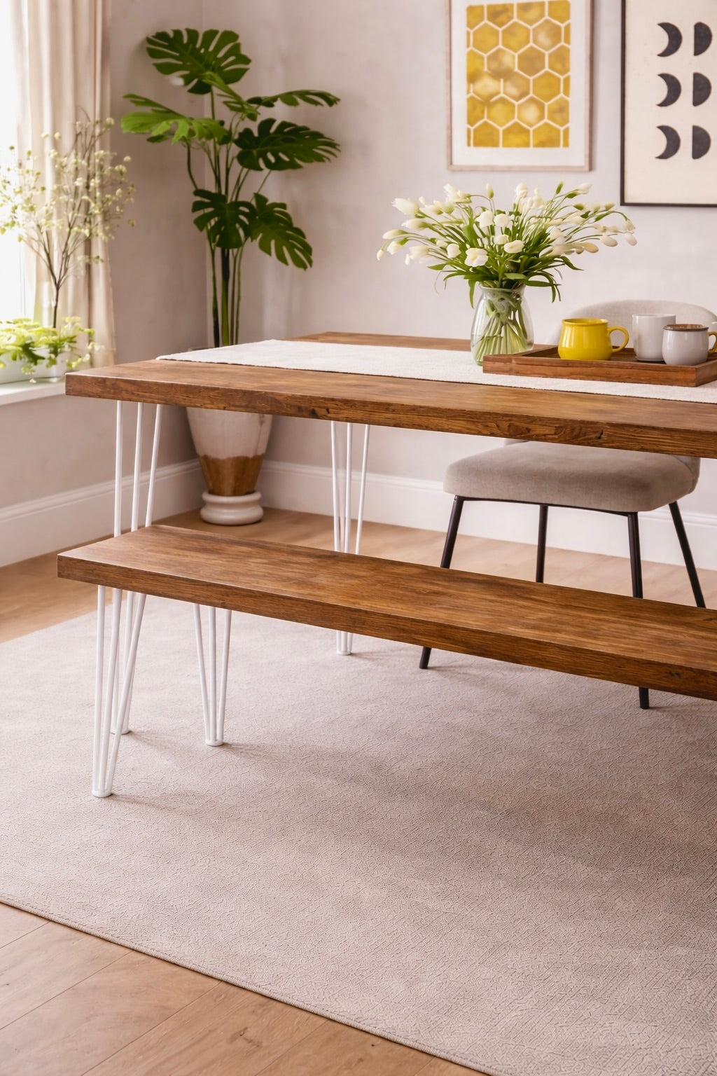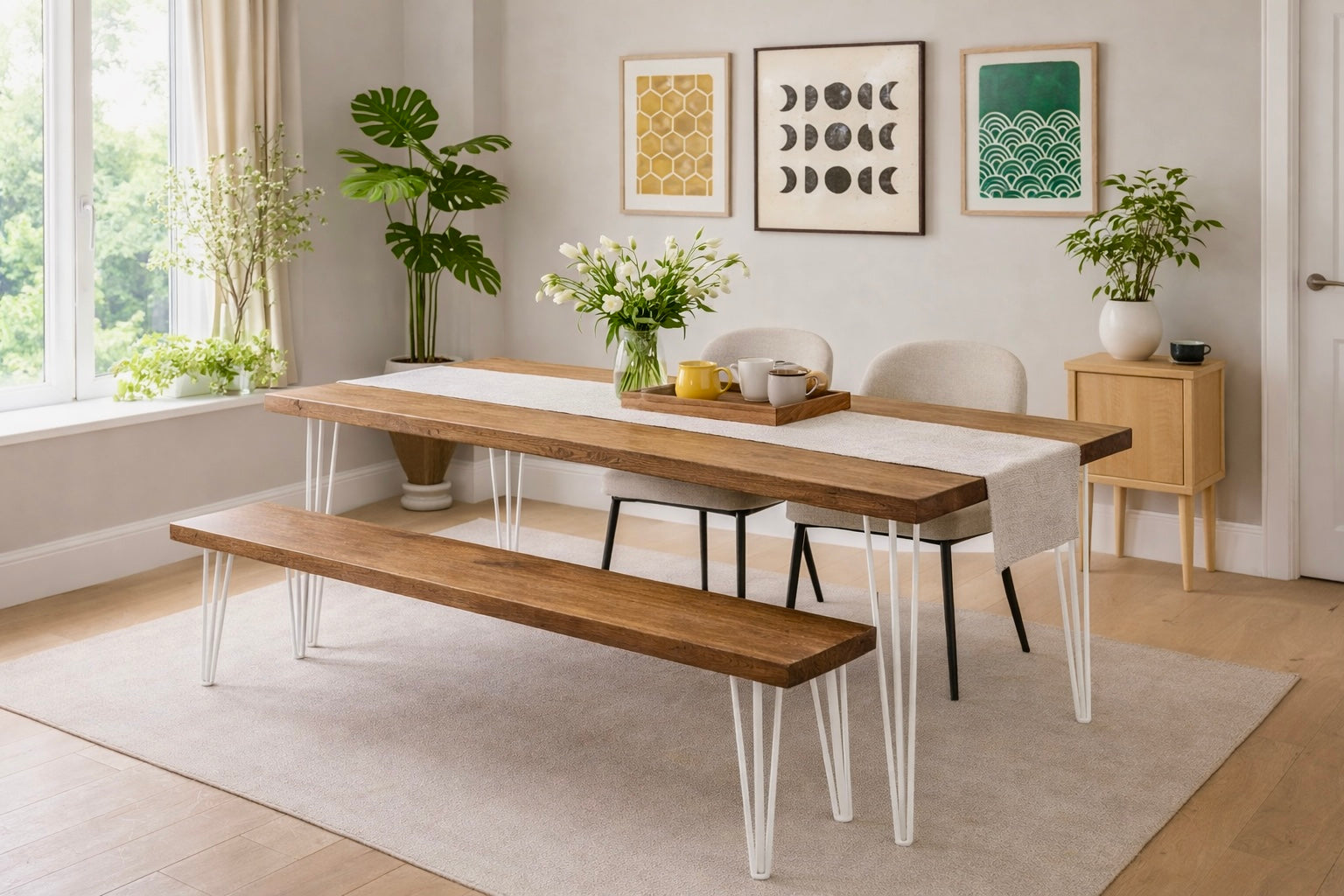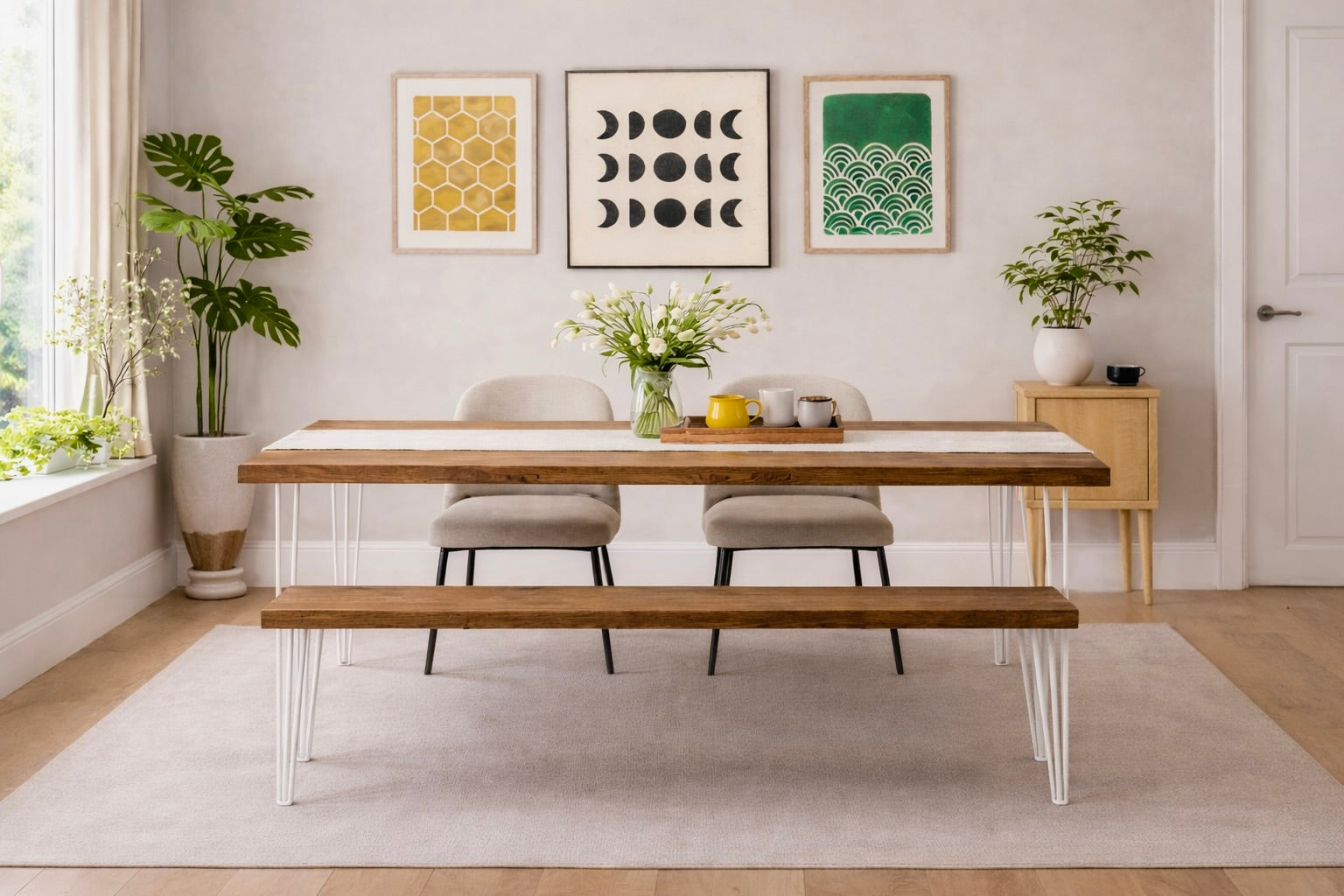 Dining table and optional benches constructed from premium grade solid wooden boards, and mounted onto steel hairpin legs.