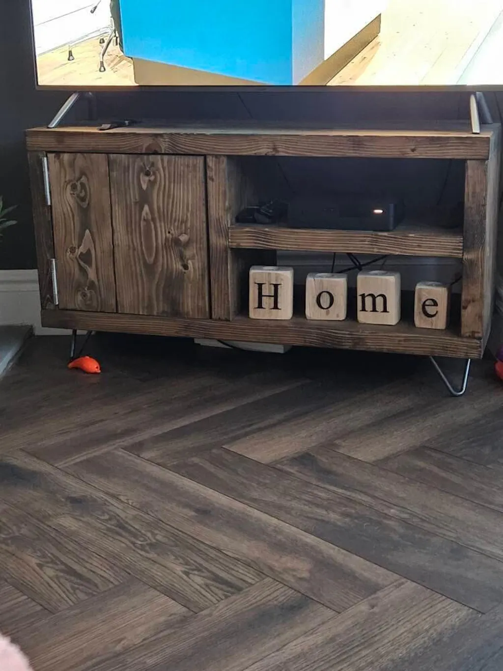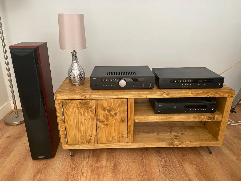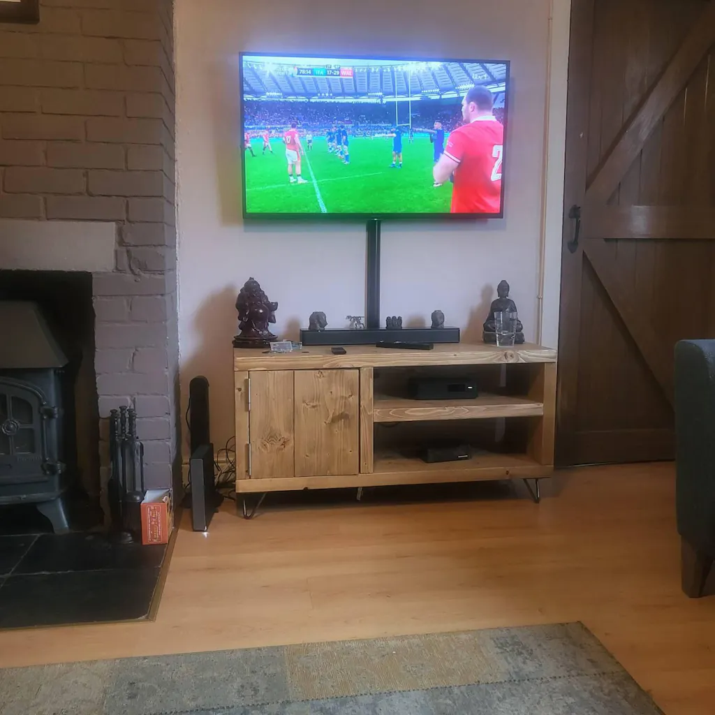 Stunning industrial style TV unit constructed from premium grade FSC certified timber and mounted onto steel hairpin legs.