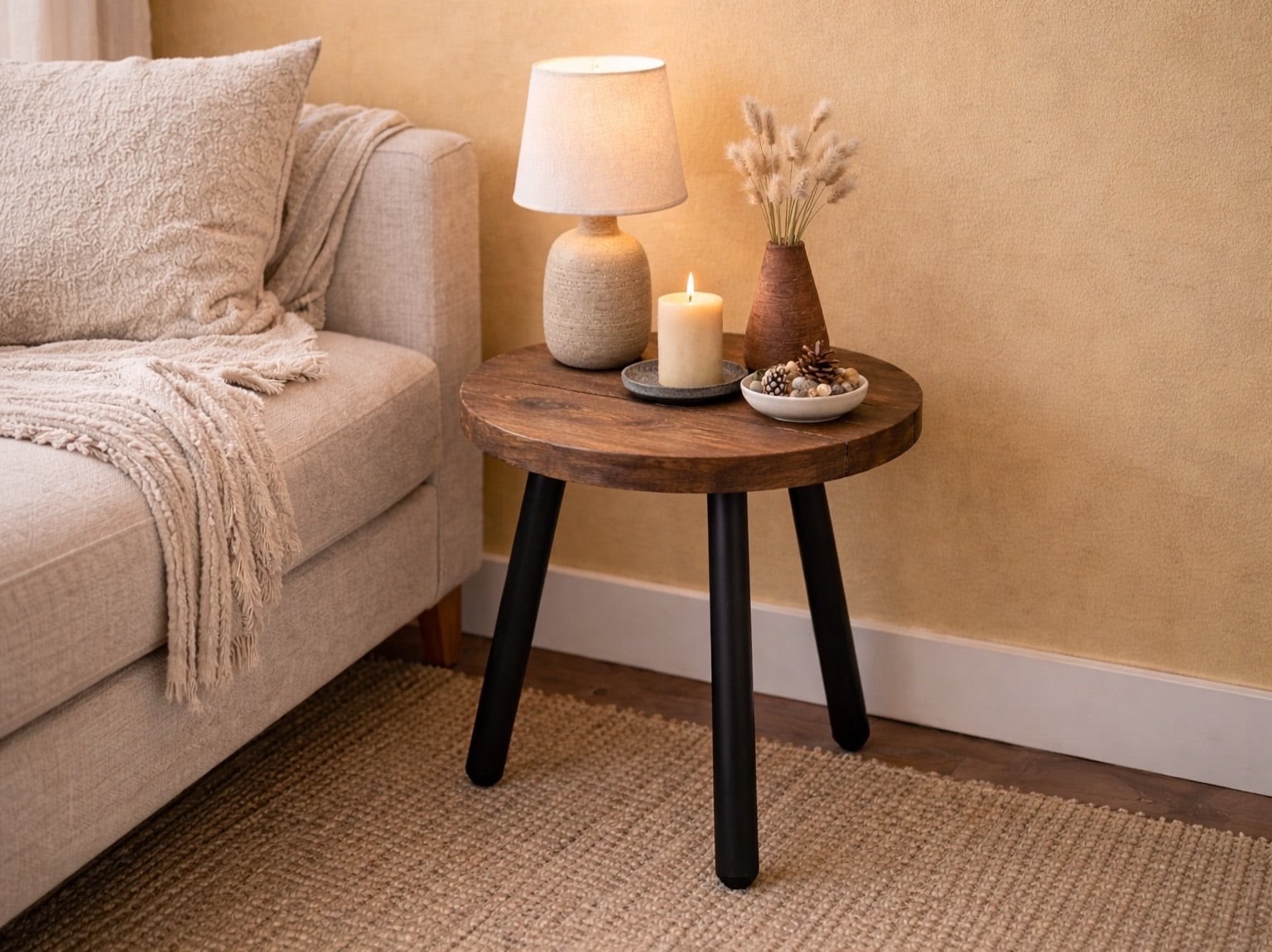 Industrial circular style side table constructed from solid wooden boards and mounted onto steel round pin legs.