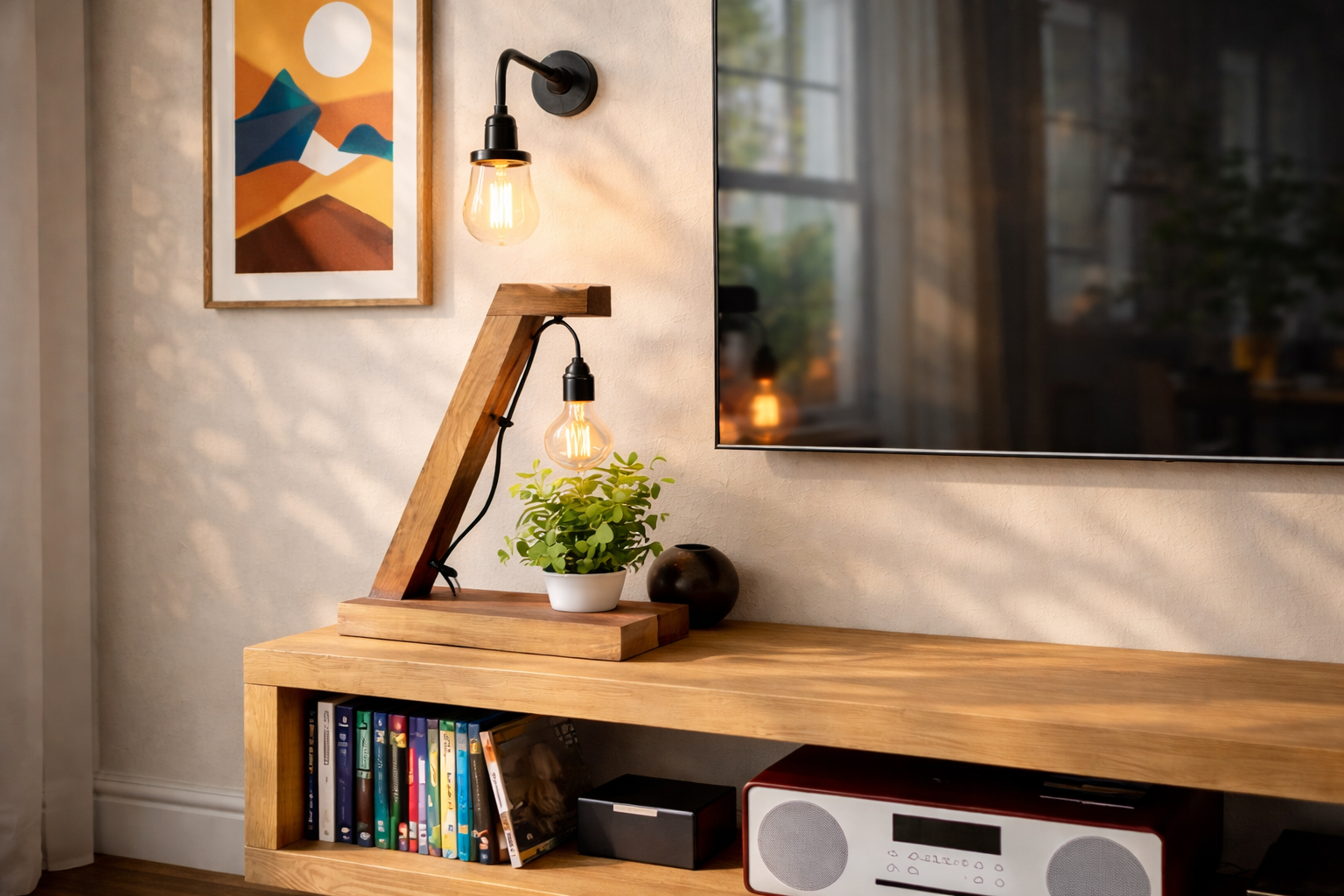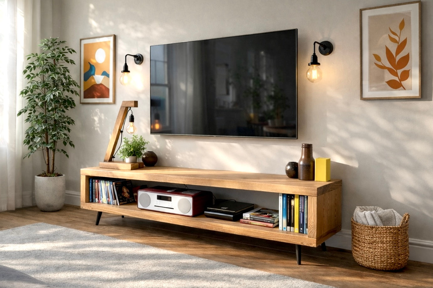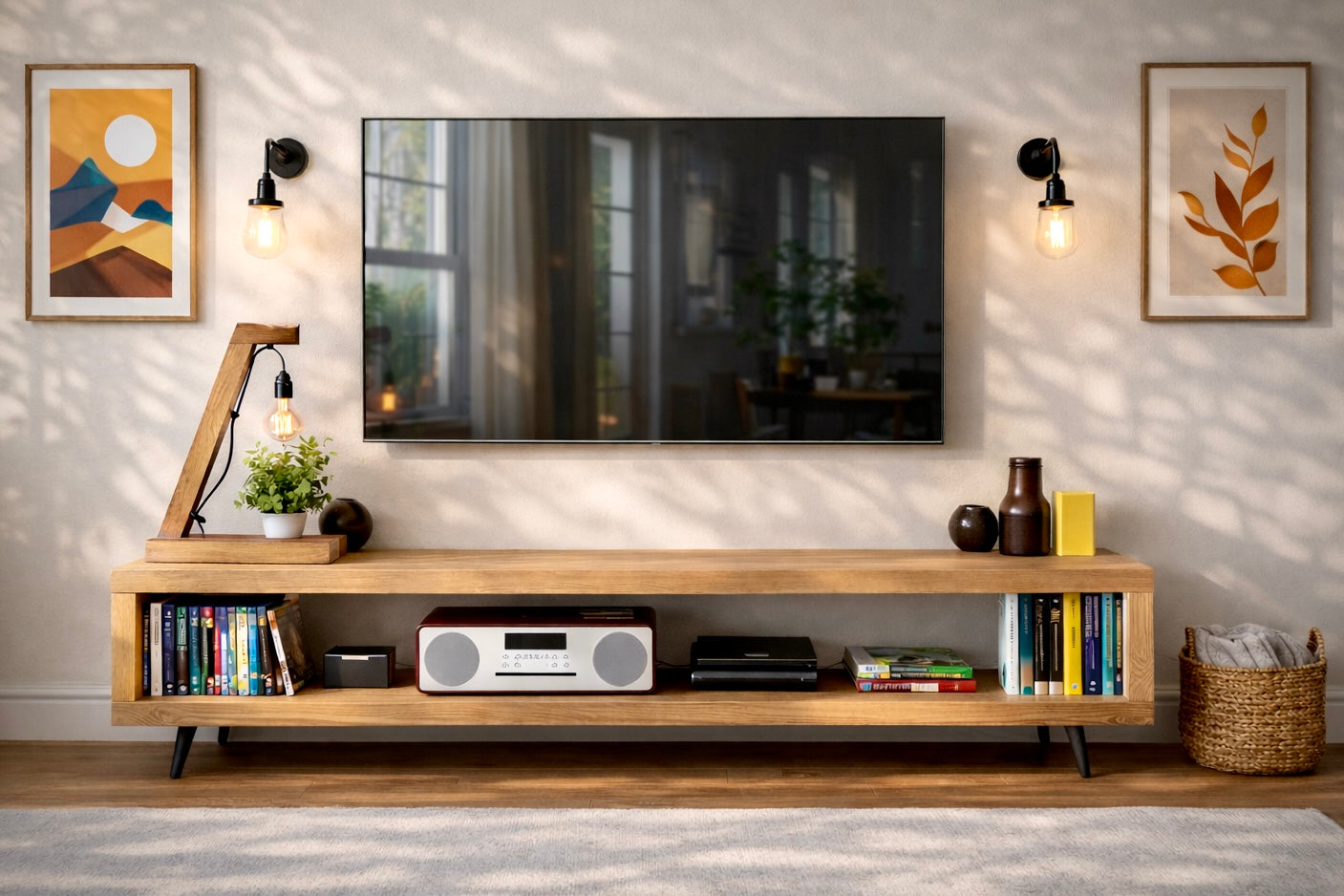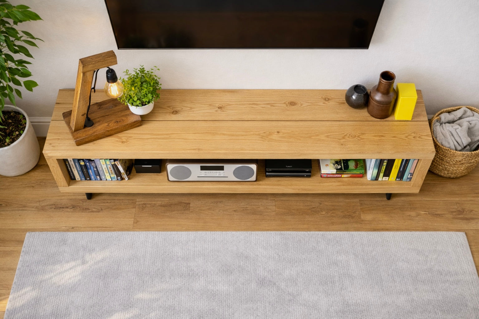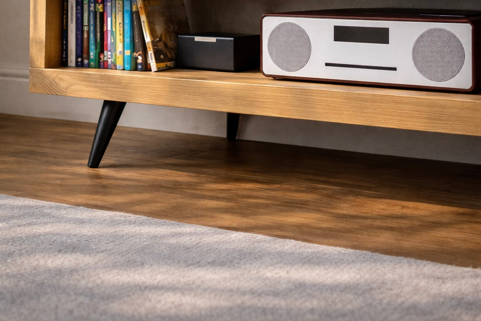 Stunning industrial style TV unit constructed from premium grade, 45mm depth FSC certified timber and mounted onto mid century style steel tapered legs.