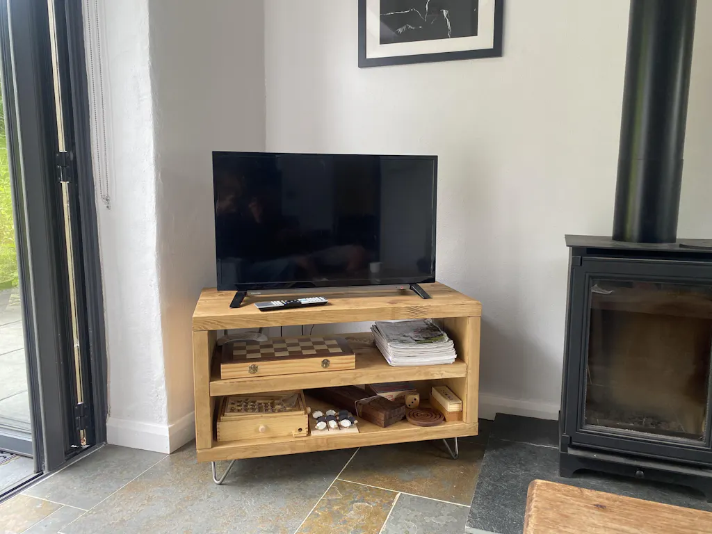 Stunning industrial style TV unit constructed from premium grade, 45mm depth boards and mounted onto steel hairpin legs. Images show the cabinet finished in our Golden tone hard wax to protect against the pressures of everyday use, while still retaining character. Also available in Pale, Antique or Rustic. Please select the option youโd like in the personalisation section.
