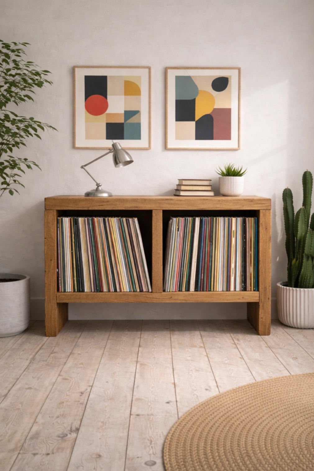 Solid wood vinyl storage unit.